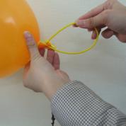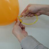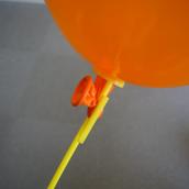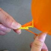 @風船を膨らまし風船口を左指で押さえ、右指で風船口をねじりますその状態でプラ棒のリ